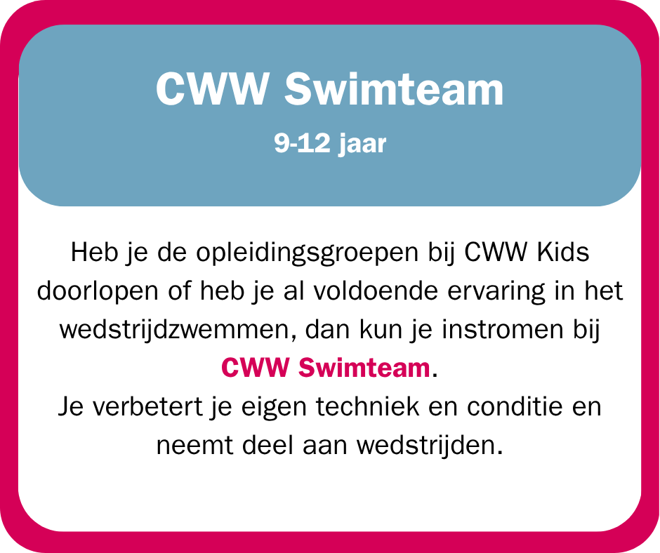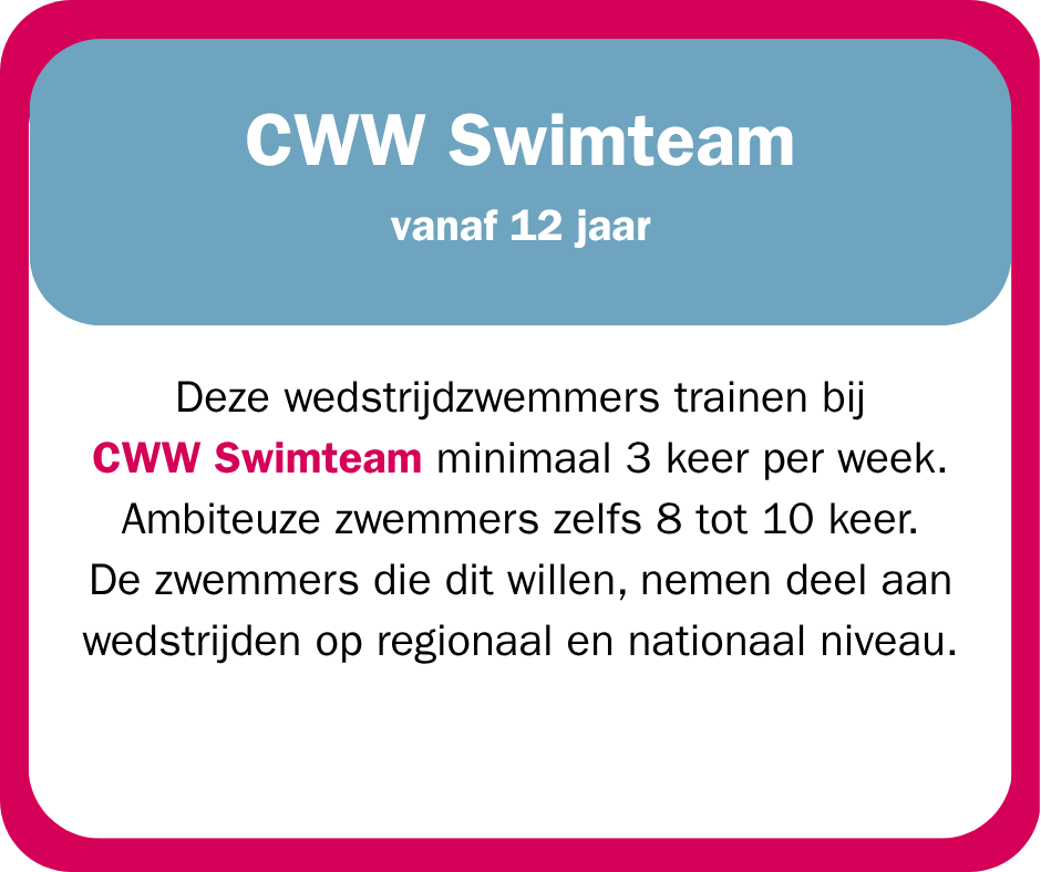 Heb je voldoende ervaring opgedaan voor het het wedstrijdzwemmen, dan kun je instromen bij CWW Swimteam.