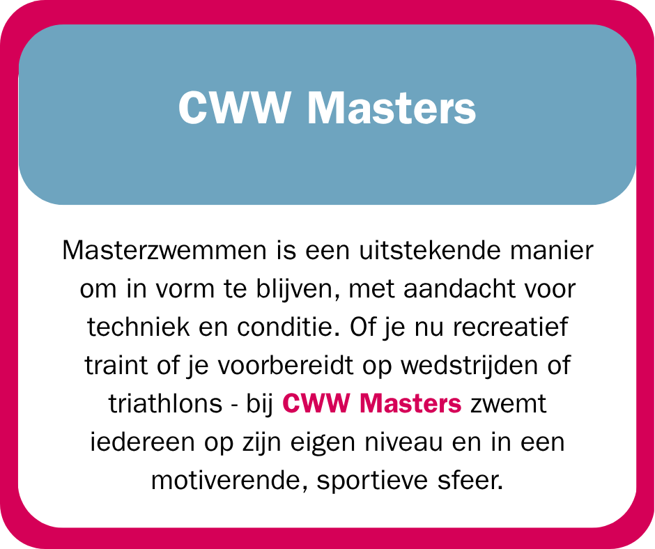 Masterzwemmen is de ideale manier om fit te blijven. Plezier in het sportief bezig zijn staat voorop, maar ie wil kan deelnemen aan masterwedstrijden of traint voor een triathlon.